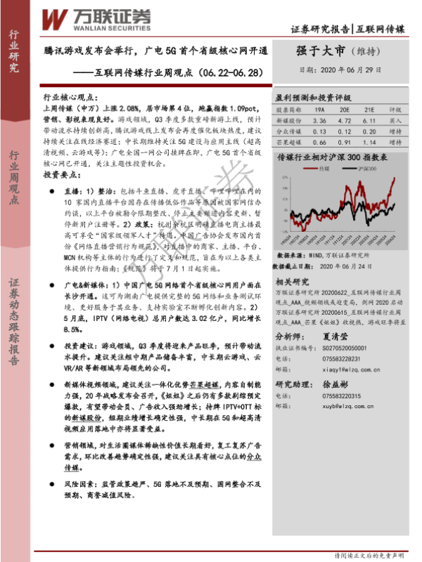 【万联证券】【20200629】20200629-万联证券-互联网传媒行业周观点:腾讯游戏发布会举行,广电5G首个省级核心网开通-13页 行业研究