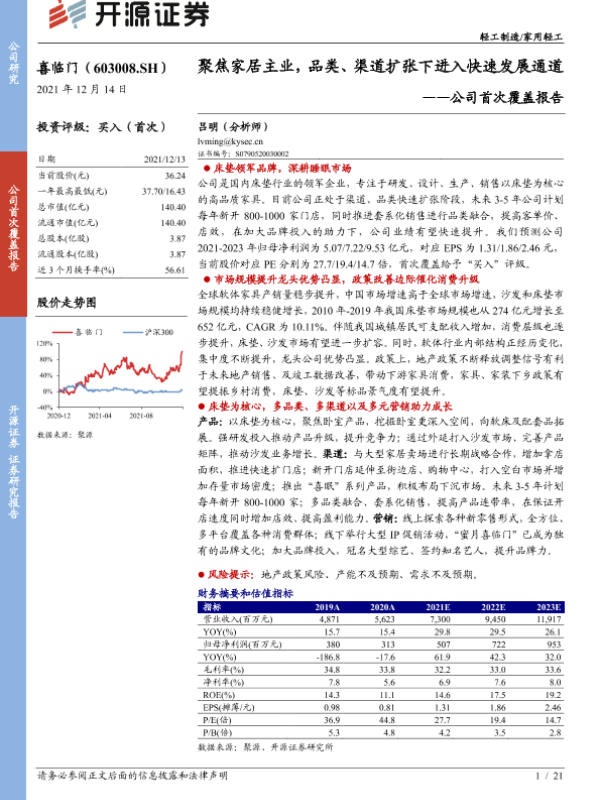 【开源证券】【20211214】喜临门-603008.SH-公司首次覆盖报告:聚焦家居主业,品类、渠道扩张下进入快速发展通道-21页 公司研究