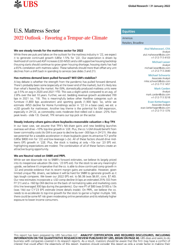 【瑞银】【20220131】瑞银-美股床垫行业-2022年展望:支持温和的气候-49页 行业研究