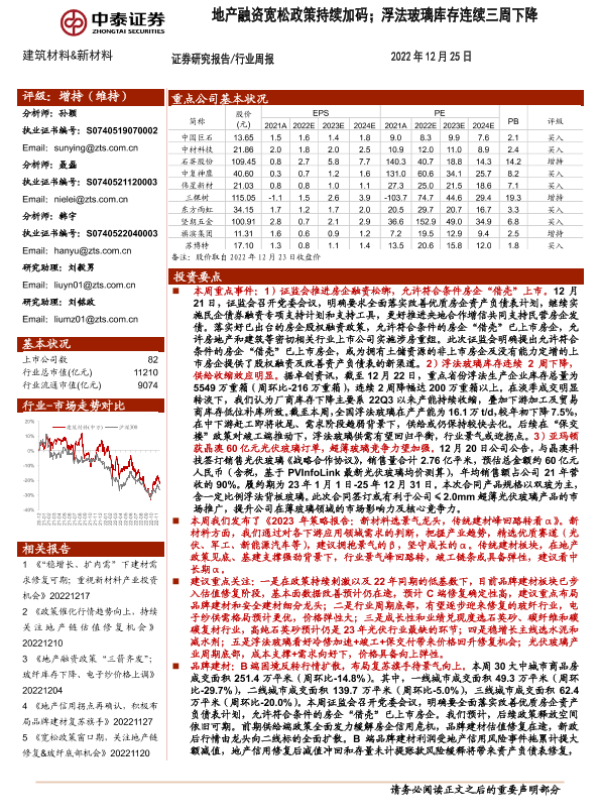 【中泰证券】【20221225】建筑材料&新材料行业周报:地产融资宽松政策持续加码;浮法玻璃库存连续三周下降-25页 行业研究
