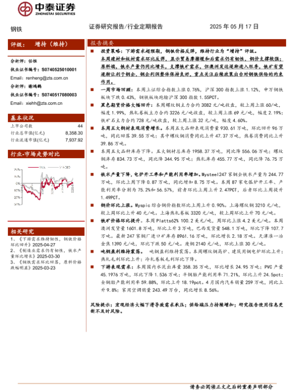 【中泰证券】【20250517】钢铁行业:下游需求超预期,钢铁价格反弹-16页 证券期货研究报告