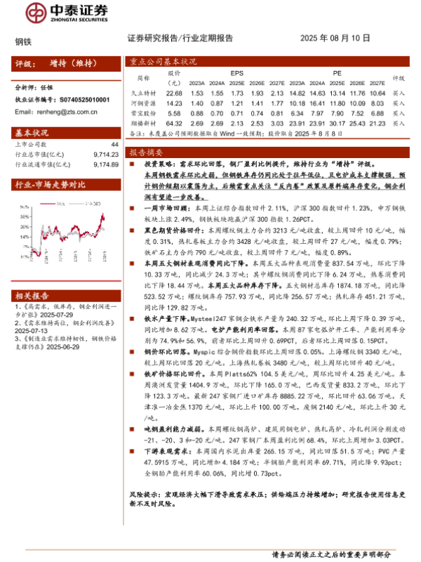 【中泰证券】【202508】钢铁行业:需求环比回落,钢厂盈利比例提升-17页 证券期货研究报告