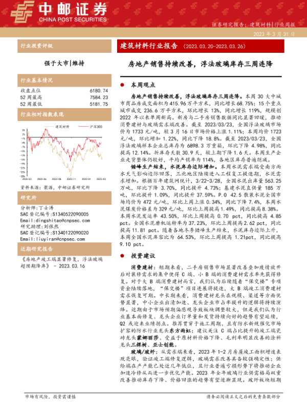 【中邮证券】【20230331】建筑材料行业报告:房地产销售持续改善,浮法玻璃库存三周连降-17页 行业研究