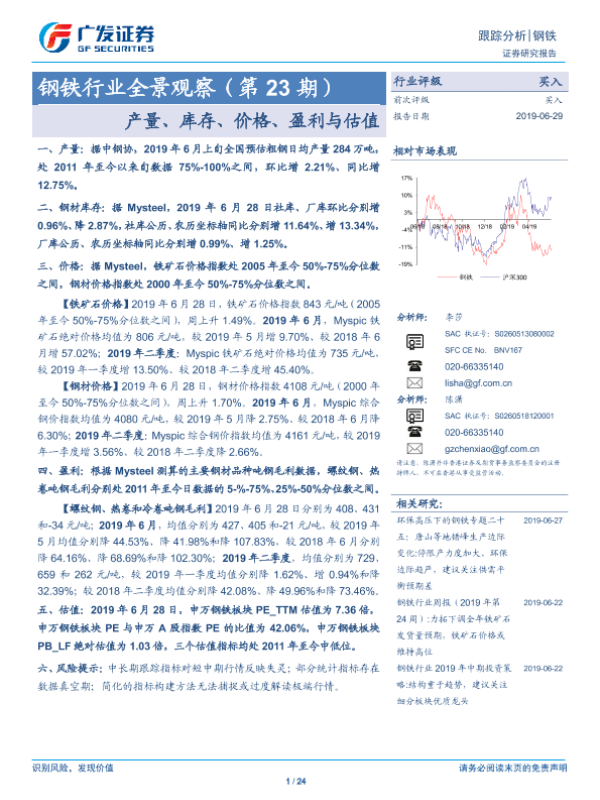 【广发证券】【20190629】20190629-广发证券-钢铁行业全景观察(第23期):产量、库存、价格、盈利与估值-24页 行业研究