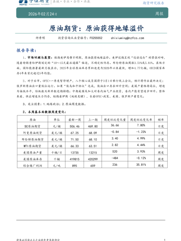 【宁证期货】【202602】原油期货:原油获得地缘溢价-7页 证券期货研究报告