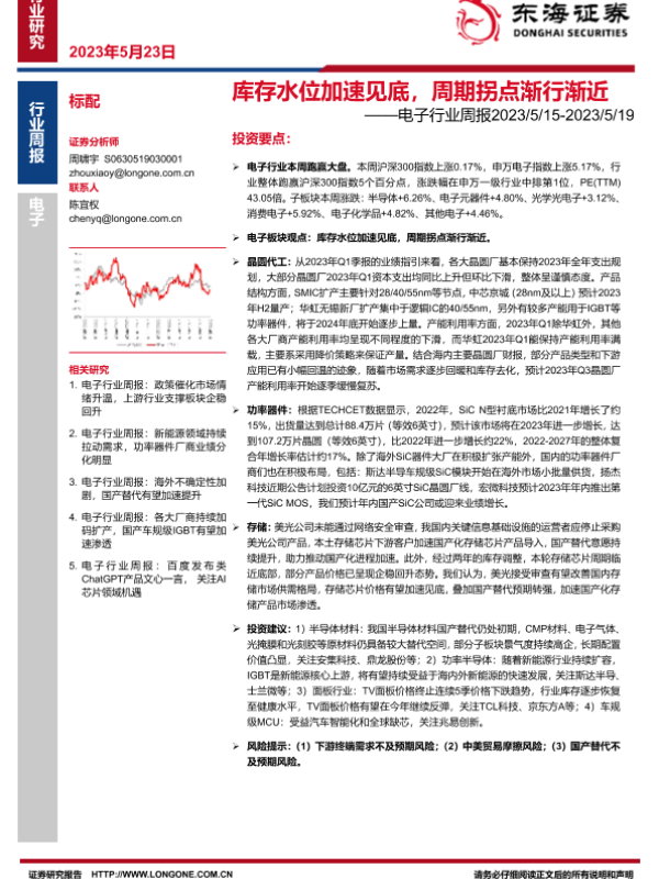 【东海证券】【20230523】电子行业周报:库存水位加速见底,周期拐点渐行渐近-12页 行业研究
