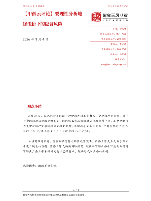 【紫金天风期货】【202603】甲醇云评论_要理性分析地缘溢价下的隐含风险-5页 证券期货研究报告