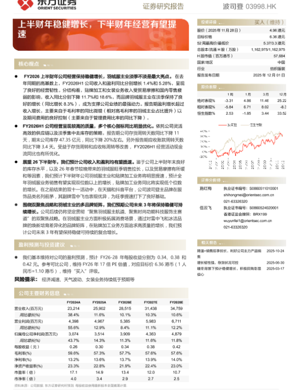 【东方证券】【202512】波司登动态跟踪——上半财年稳健增长,下半财年经营有望提速-5页 证券期货研究报告