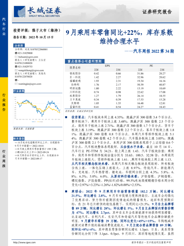 【长城证券】【20221015】汽车周报2022第34期:9月乘用车零售同比+22%,库存系数维持合理水平-15页 行业研究