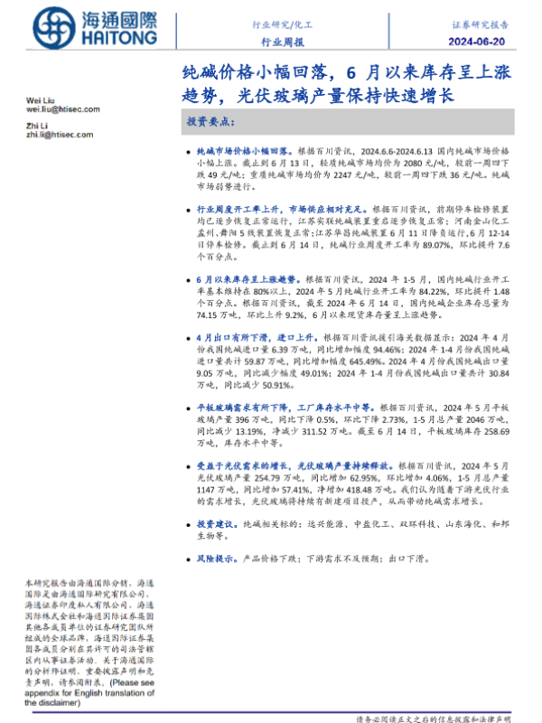 【海通国际】【20240619】20240620-海通国际-化工行业周报:纯碱价格小幅回落,6月以来库存呈上涨趋势,光伏玻璃产量保持快速增长-15页 行业研究
