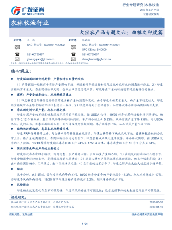 【广发证券】【20190609】大宗农产品专题之六:白糖之印度篇-21页 行业研究