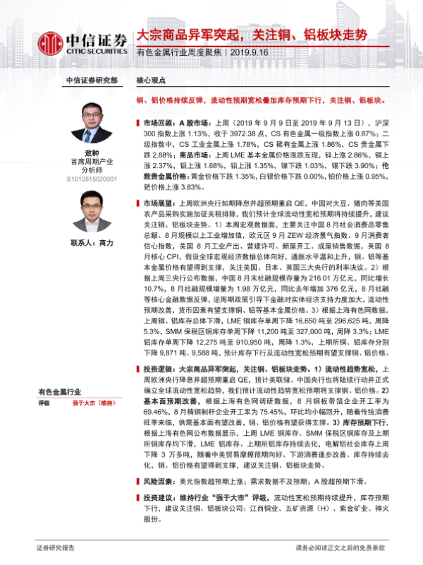 【中信证券】【20190916】20190916-中信证券-有色金属行业周度聚焦:大宗商品异军突起,关注铜、铝板块走势-18页 行业研究