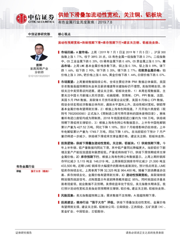 【中信证券】【20190708】20190708-中信证券-有色金属行业周度聚焦:供给下滑叠加流动性宽松,关注铜、铝板块-18页 行业研究