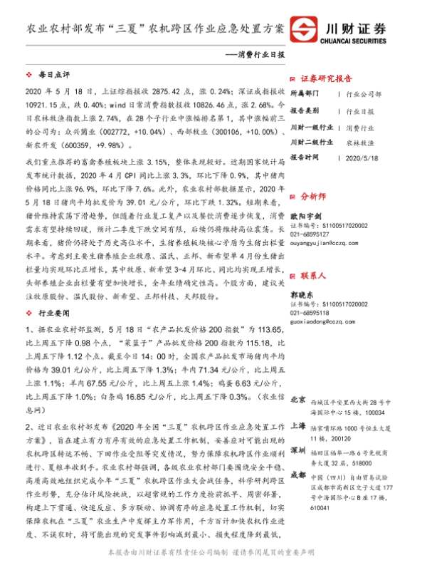 【川财证券】【20200518】消费行业日报:农业农村部发布“三夏”农机跨区作业应急处置方案-3页 证券期货研究报告