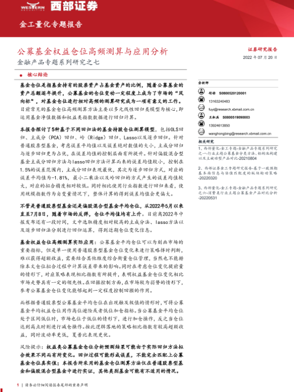 【西部证券】【20220720】金融产品专题系列研究之七:公募基金权益仓位高频测算与应用分析-21页 行业研究