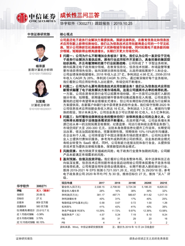 【中信证券】【20191025】20191025-中信证券-华宇软件-300271.SZ-跟踪报告:成长性三问三答-38页 行业研究