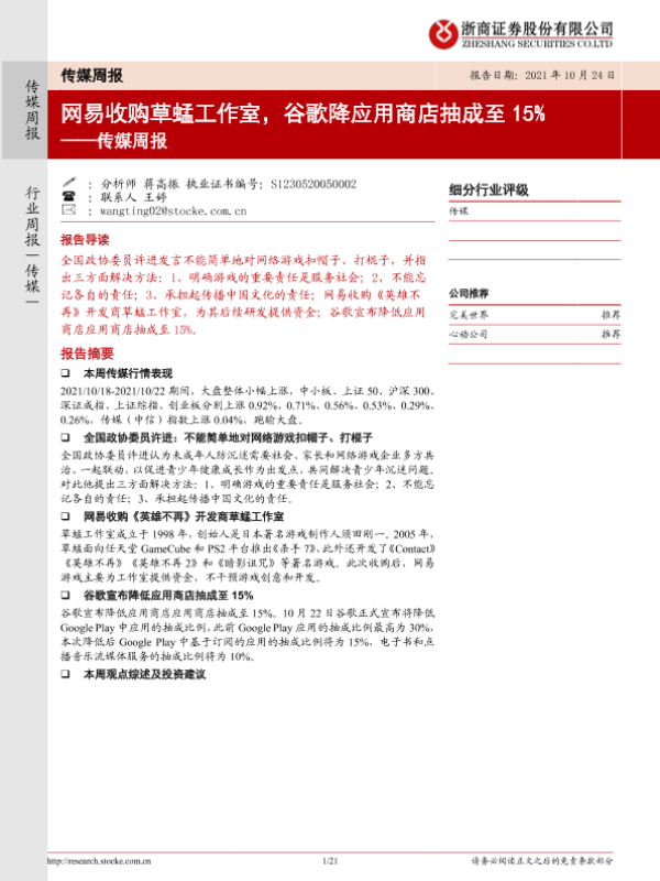 【浙商证券】【20211024】20211024-浙商证券-传媒周报:网易收购草蜢工作室,谷歌降应用商店抽成至15%-21页 行业研究