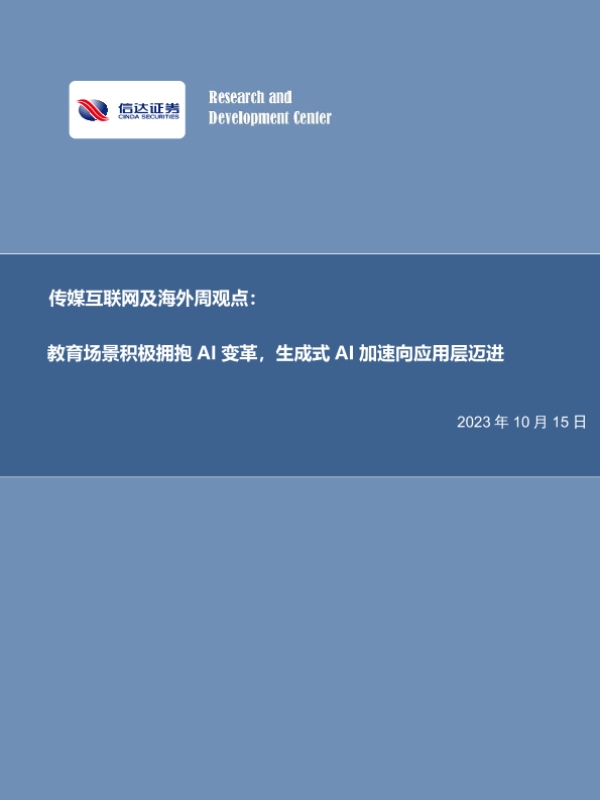 【信达证券】【20231015】传媒互联网及海外周观点:教育场景积极拥抱AI变革,生成式AI加速向应用层迈进-13页 行业研究