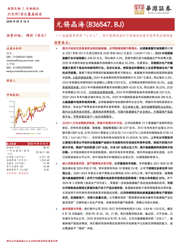 【华源证券】【202509】无锡晶海(836547)氨基酸原料药“小巨人”,新产能释放叠加下游领域拓展有望带来业绩增量-25页 证券期货研究报告