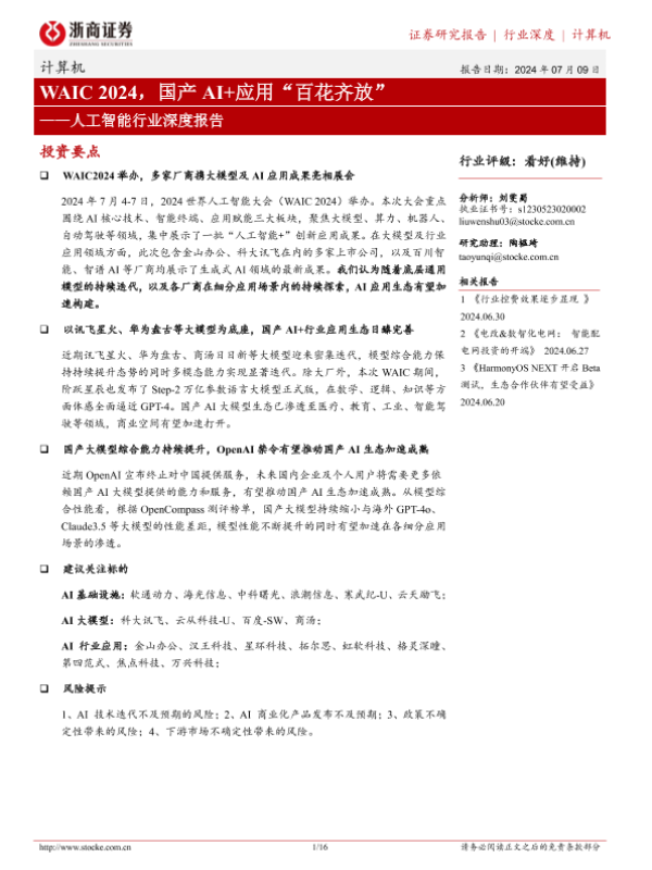 【浙商证券】【20240709】20240709-浙商证券-人工智能行业深度报告:WAIC 2024,国产AI+应用“百花齐放"-16页 行业研究