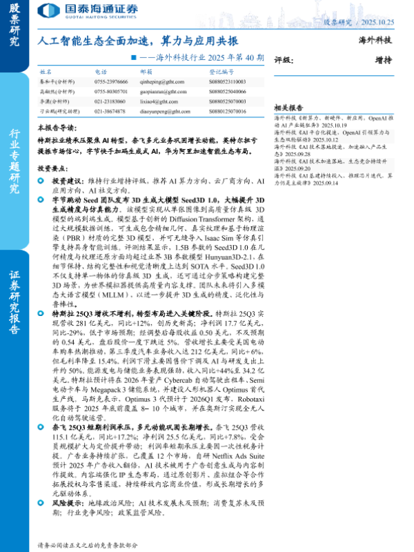 【国泰海通证券】【202510】人工智能生态全面加速,算力与应用共振-10页 证券期货研究报告