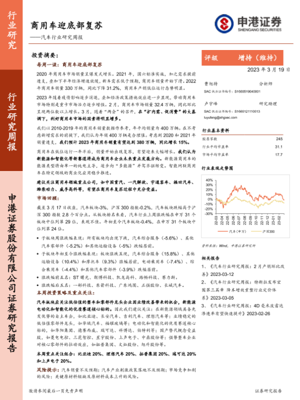 【申港证券】【20230319】汽车行业研究周报:商用车迎底部复苏-15页 行业研究