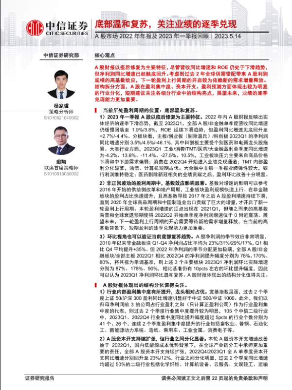 【中信证券】【20230514】A股市场2022年年报及2023年一季报回顾:底部温和复苏,关注业绩的逐季兑现-23页 行业研究