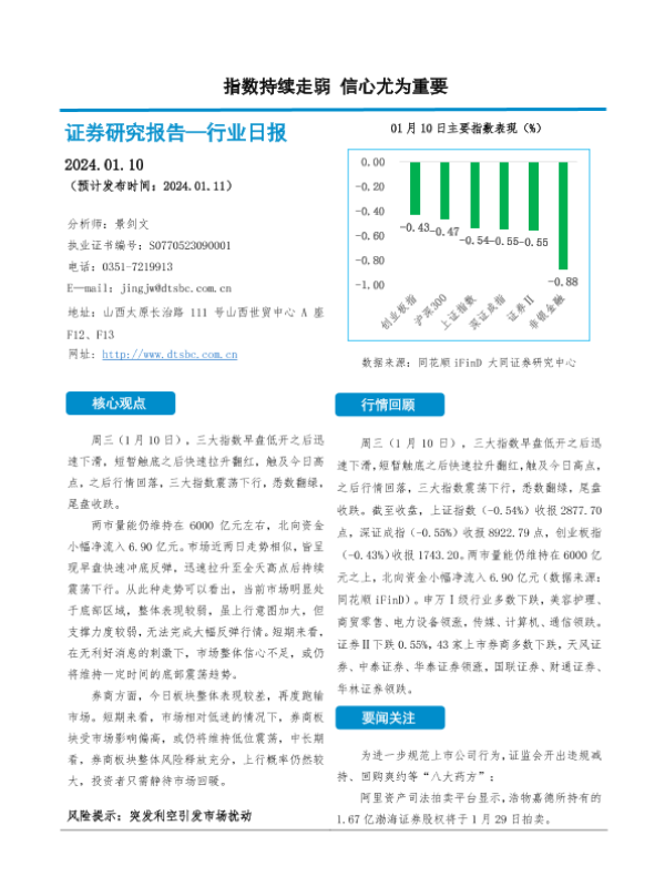 【大同证券】【20240110】非银金融行业日报:指数持续走弱 信心尤为重要-10页 行业研究