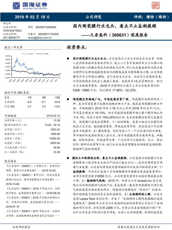 【国海证券】【20190218】国内陶瓷膜行业龙头,看点不止盐湖提锂-37页 行业研究