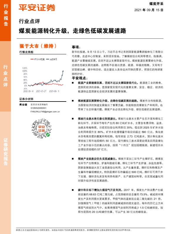 【平安证券】【20210915】煤炭开采行业点评:煤炭能源转化升级,走绿色低碳发展道路-3页 行业研究
