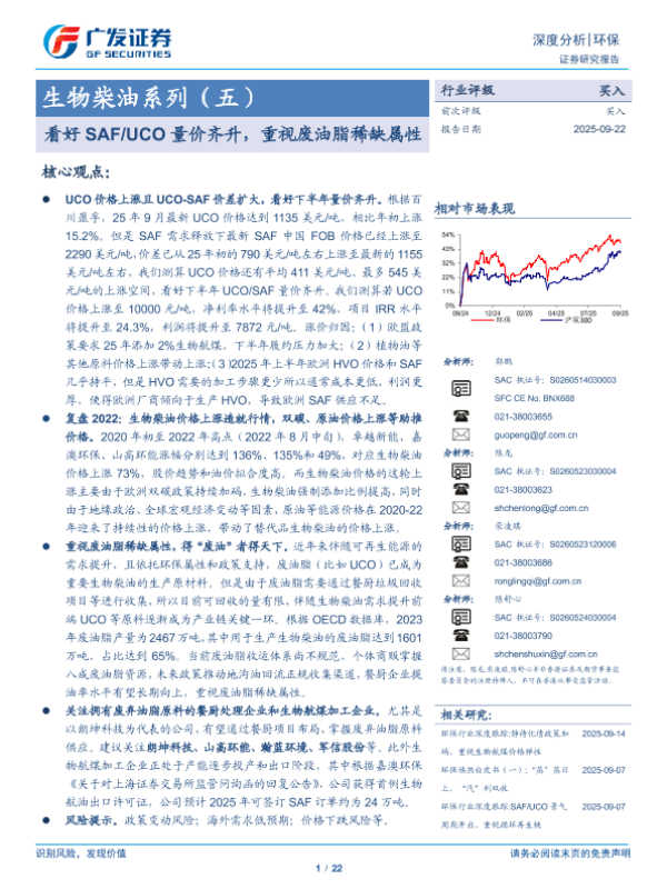 【广发证券】【202509】看好 SAF/UCO量价齐升,重视废油脂稀缺属性-22页 证券期货研究报告
