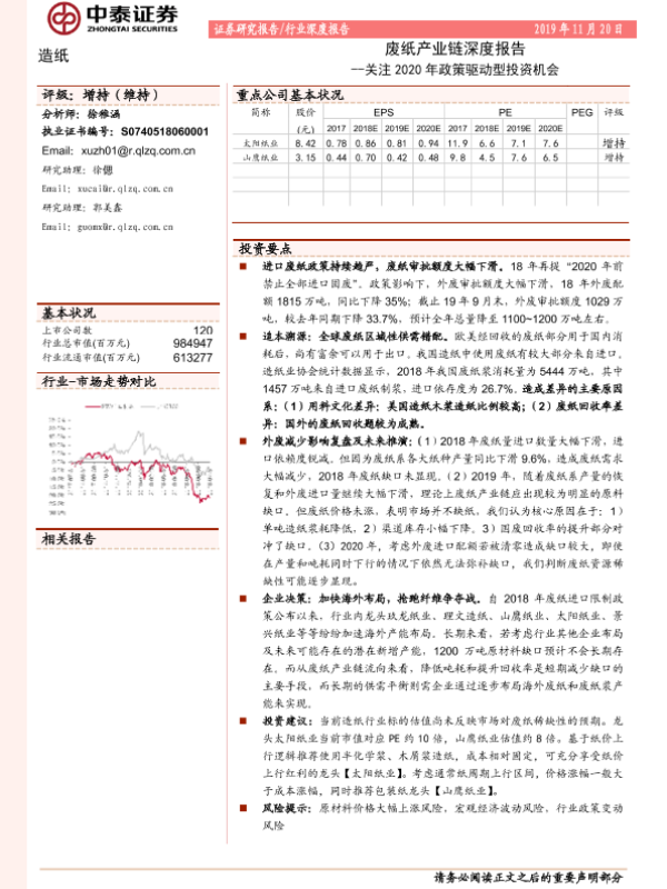 【中泰证券】【20191120】20191120-中泰证券-废纸产业链深度报告:关注2020年政策驱动型投资机会-20页 行业研究