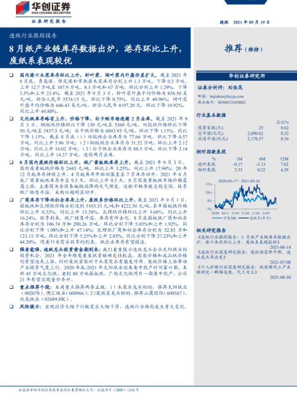 【华创证券】【20210919】20210919-华创证券-造纸行业跟踪报告:8月纸产业链库存数据出炉,港存环比上升,废纸系表现较优-17页 行业研究