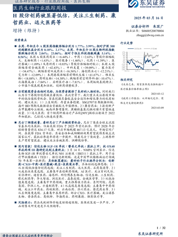 【东吴证券】【20250316】20250316-东吴证券-医药生物行业跟踪周报:H股仿创药被显著低估,关注三生制药、康哲药业、远大医药等-32页 行业研究
