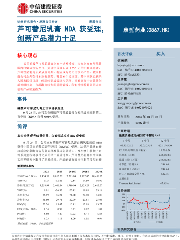【中信建投证券】【20241007】康哲药业(0867.HK)芦可替尼乳膏NDA获受理,创新产品潜力十足-10页 行业研究