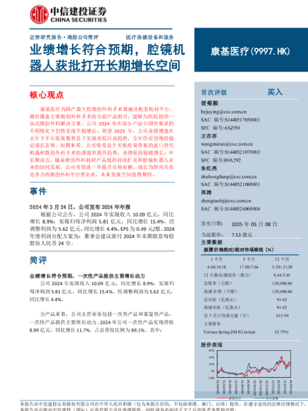 【中信建投证券】【20250508】康基医疗业绩增长符合预期,腔镜机器人获批打开长期增长空间-10页 证券期货研究报告