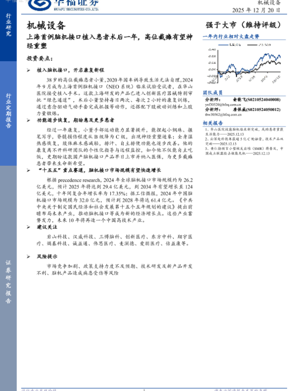 【华福证券】【202512】上海首例脑机接口植入患者术后一年,高位截瘫有望神经重塑-2页 证券期货研究报告