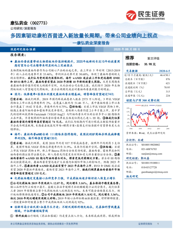 【民生证券】【20200608】20200608-民生证券-康弘药业-002773.SZ-康弘药业深度报告:多因素驱动康柏西普进入新放量长周期,带来公司业绩向上拐点-36页 行业研究