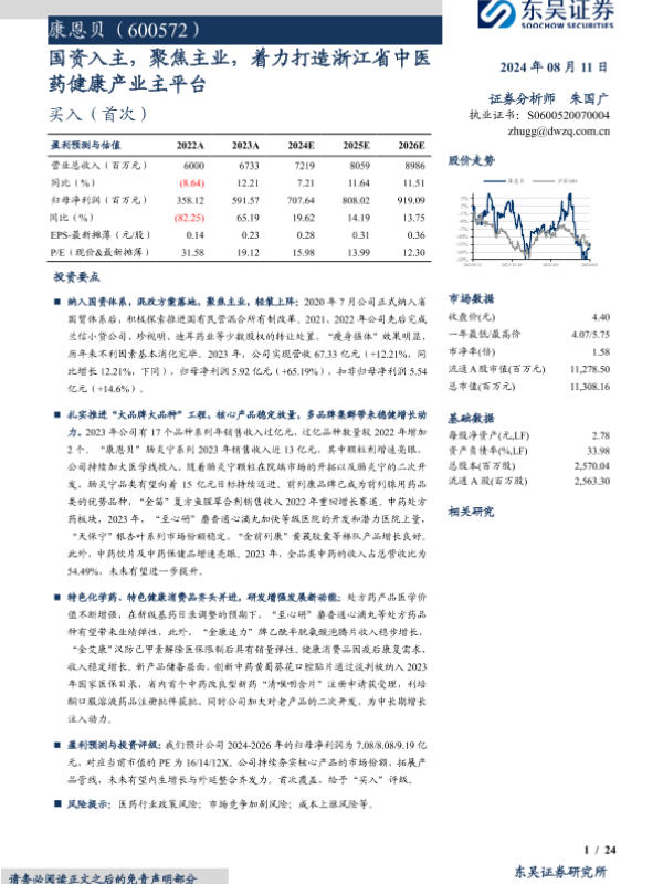 【东吴证券】【20240811】康恩贝(600572)国资入主,聚焦主业,着力打造浙江省中医药健康产业主平台-24页 行业研究