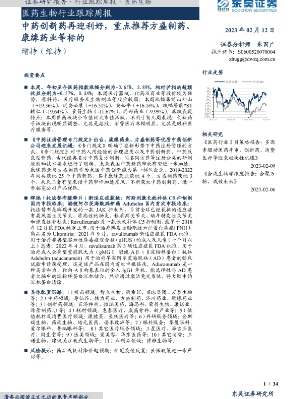 【东吴证券】【20230212】医药生物行业跟踪周报:中药创新药再迎利好-34页 行业研究
