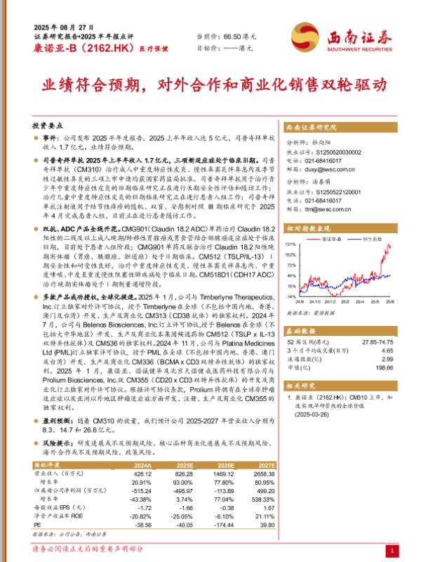 【西南证券】【20250827】康诺亚-B-业绩符合预期_对外合作和商业化销售双轮驱动-6页 证券期货研究报告