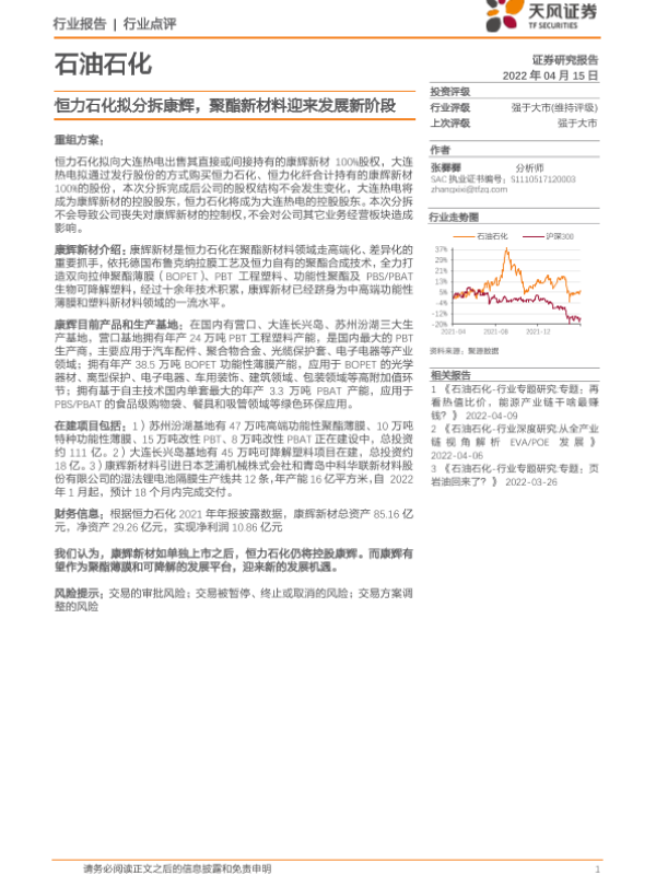 【天风证券】【20220415】石油石化行业点评:恒力石化拟分拆康辉,聚酯新材料迎来发展新阶段-2页 行业研究
