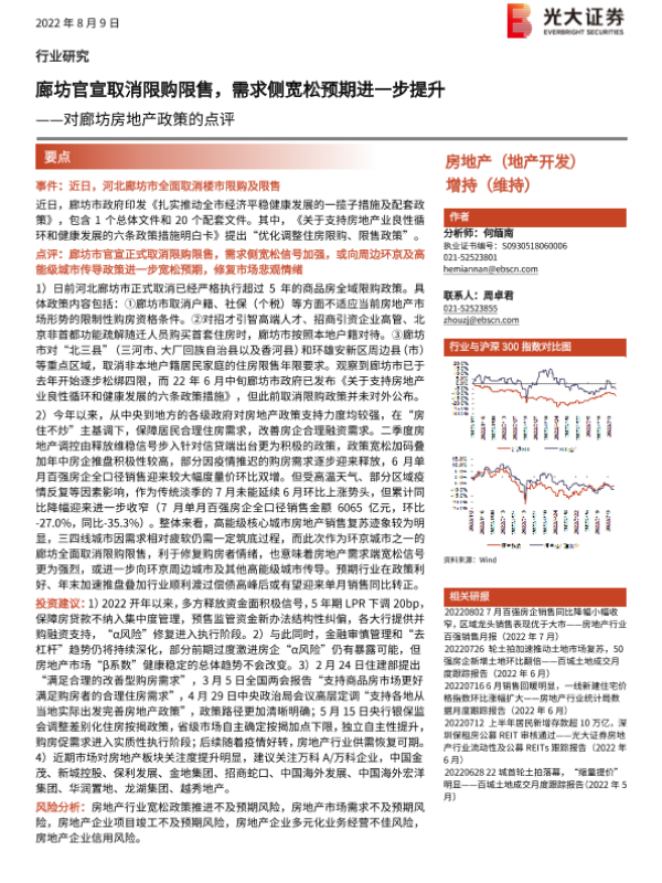 【光大证券】【20220809】对廊坊房地产政策的点评:廊坊官宣取消限购限售,需求侧宽松预期进一步提升-2页 行业研究