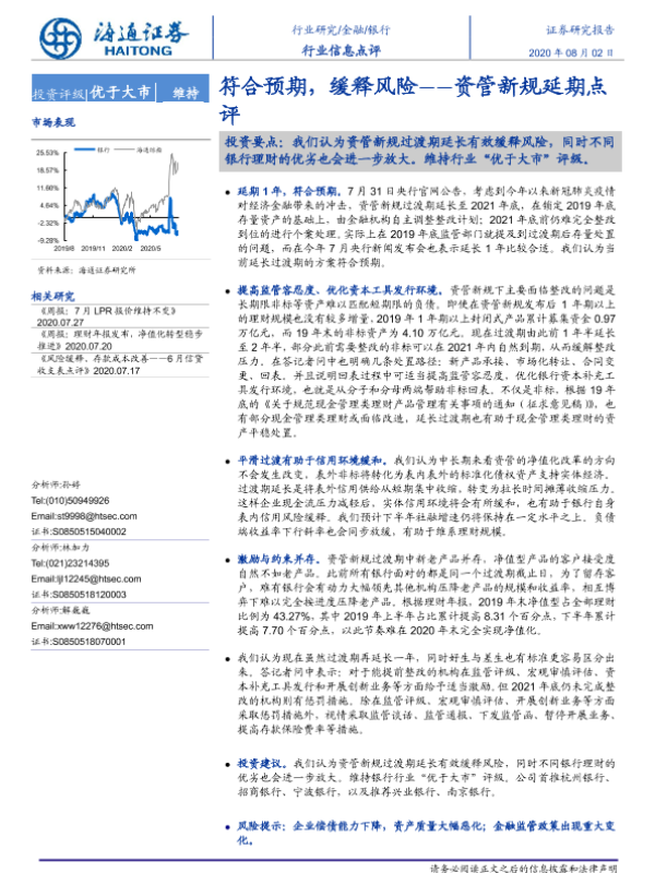【海通证券】【20200802】银行行业信息点评:符合预期,缓释风险--资管新规延期点评-2页 行业研究