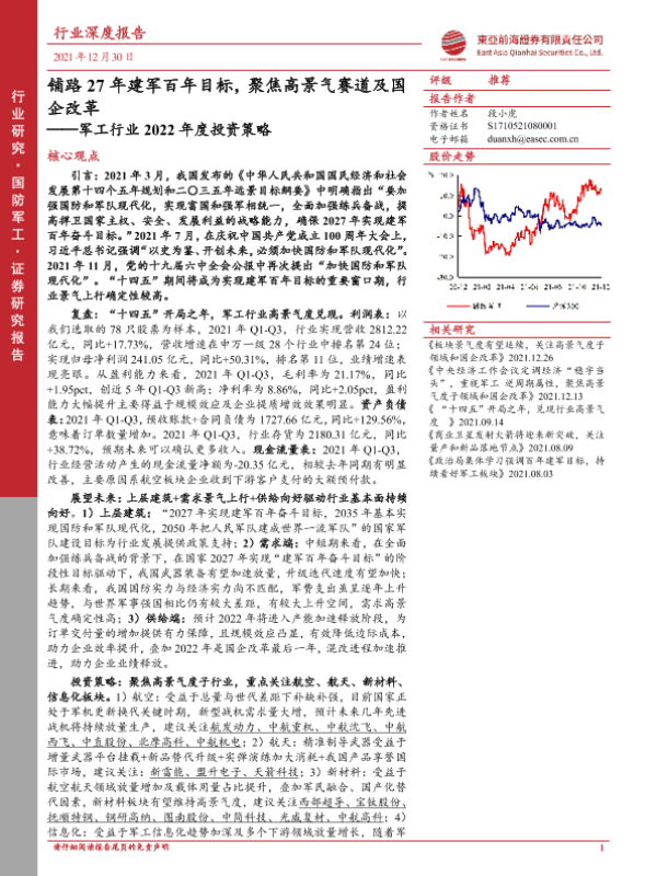 【东亚前海证券】【20211230】军工行业2022年度投资策略:铺路27年建军百年目标,聚焦高景气赛道及国企改革-74页 行业研究