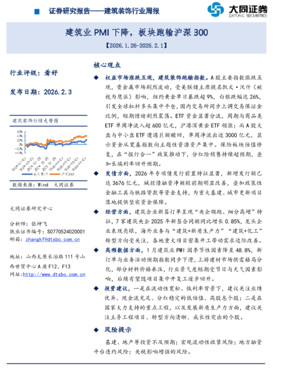 【大同证券研究中心】【202602】建筑业PMI下降,板块跑输沪深300-15页 证券期货研究报告