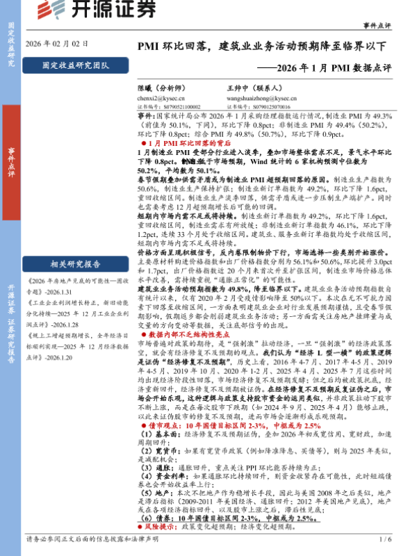 【开源证券】【202602】2026年1月PMI数据点评:PMI环比回落,建筑业业务活动预期降至临界以下-6页 证券期货研究报告