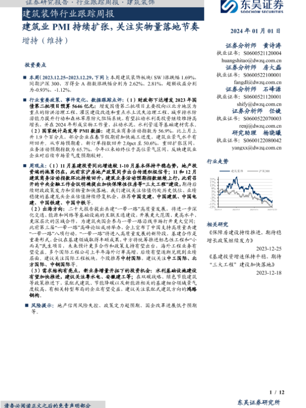 【东吴证券】【20240101】建筑装饰行业跟踪周报:建筑业PMI持续扩张,关注实物量落地节奏-12页 行业研究