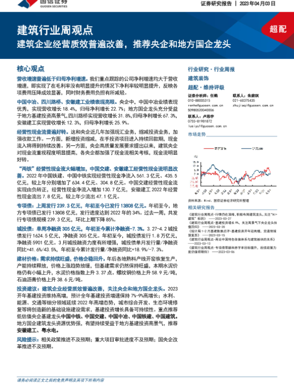 【国信证券】【20230403】建筑行业周观点:建筑企业经营质效普遍改善,推荐央企和地方国企龙头-12页 行业研究