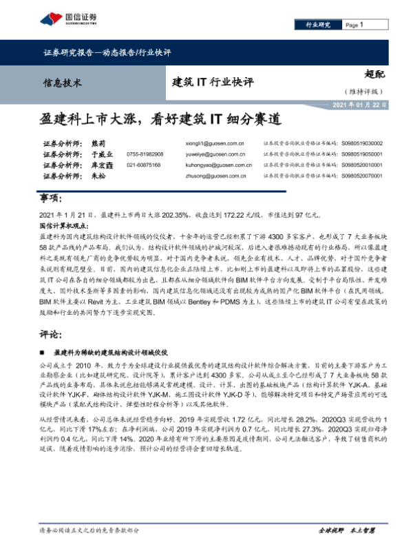 【国信证券】【20210122】建筑IT行业快评:盈建科上市大涨,看好建筑IT细分赛道-8页 行业研究
